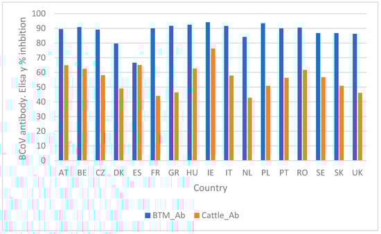 BCoV mean antibody levels (% inhibition in Elisa) in bulk tank milk (BTM_Ab) and the mean antibody levels of neonatal calves, weaned calves, and fresh cows (Cattle_Ab) in the enrolled European dairy farms stratified by country.