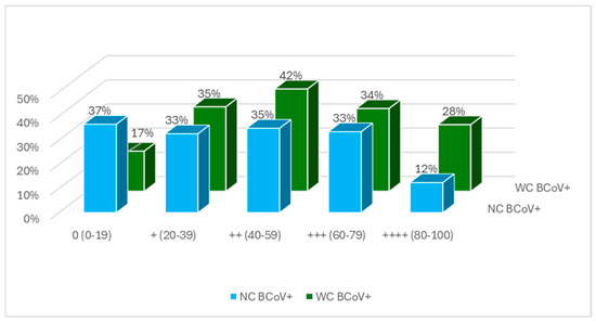 Sample analysis: The samples were accompanied with a sampling record stating animal id; animal category (NC, WC, or FC); birth date; weaning date for WC and calving date for FC; and sampling date. Also, the animal health history within the previous 3 months was collected. The samples were sent chilled to the contracted laboratory in Boxmeer, the Netherlands. The presence of BCoV virus was analyzed with a duplex Real-Time RT-PCR (Kylt® Bovine Coronavirus In-Vitro Diagnostica, AniCon Labor GmbH, Hoeltinghausen, Germany). Ct-values < 35 were classified as positive samples, and Ct-values ≥ 35 were classified as negative. Bulk tank milk BCoV antibodies and serum BCoV antibodies were analyzed using a competitive monoscreen ELISA test (Bio-X 392/2, Bio-X Diagnostics S.A., Rochefort, Belgium). The outcomes of the serum and bulk tank milk samples were percentage inhibition (%inh) of the optical density readings. The samples’ degree of positivity was categorized according to test manuals from 0 to 4 (%inh < 20 = 0, 20 ≤ %inh < 40 = 1 (+), 40 ≤ %inh < 60 = 2 (++), 60 ≤ %inh < 80 = 3 (+++), and %inh ≥ 80 = 4 (++++)).
