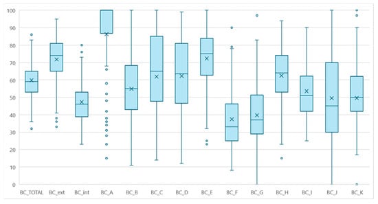 Boxplot distributions of Biocheck scores for 118 dairies. BC-ext (External biosecurity) includes BC-A (purchase and reproduction), BC-B (transports and carcass removal), BC-C (feed and water), BC-D (farm workers and visitors), and BC-E (control of vermin and pets). The BC-int (internal biosecurity) includes BC-F (management of health), BC-G (calving management), BC-H (calf management), BC-I (milking parlor), BC-J (adult cattle management), and BC-K (working and overall organization and equipment).
