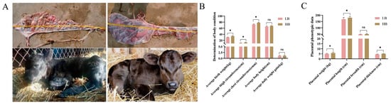 After delivery, we immediately measured the phenotype data of the calves and placenta in the Shandong black cattle (Figure 1A). Based on the data of 20 calves, we found significant differences (p < 0.05) in their weight. They were divided into two groups based on the weight, namely, the LB group, with an average birth weight of 29.535 ± 0.593 kg, and the HB group, with an average birth weight of 34.325 ± 0.342 kg. Interestingly, compared with the LB group, the thigh and chest circumference of the calves in the HB group were significantly increased (p < 0.05) (Figure 1B). At the same time, there were differences in the placental weight, length, width, and thickness between the LB group and the HB group (p < 0.05). Specifically, the weight, length, and, compared with LB group, placental thickness in the HB group was significantly increased (p < 0.05). However, there was no significant difference in the placental width (Figure 1C).