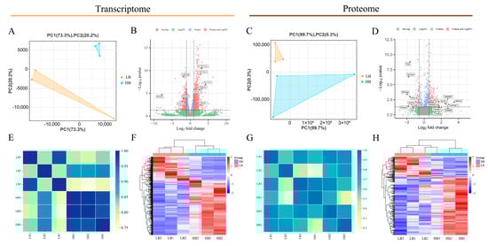 Comparison of the DEGs and DEPs between the LB and HB calves. (A) Principal component analysis of all quantitative RNA. (B) DEGs volcano map. (C) Principal component analysis of all quantitative protein. (D) DEPs volcano map. (E) Intra-transcriptome correlation heat map. (F) DEGs heat map. (G) Intra-proteome correlation heat map. (H) DEPs heat map. In (B,D), a red dot indicates that the p-value and log2(FC) of the DEGs/DEPs reached the threshold, a green dot indicates that the log2(FC) of the DEGs/DEPs reached the threshold, and a blue dot indicates that the p-value of the DEGs/DEPs reached the threshold. Gray dots indicate insignificant differences. A total of 1494 DEGs and 294 DEPs were detected. There were 1036 upregulated genes and 217 upregulated proteins. There were 458 downregulated genes and 77 downregulated proteins. The x-axis represents the log2(fold change) and the y-axis represents the −log10 (p-value). The dashed line represents the threshold (fold change > 1.5, p < 0.05), plotted according to its log2(fold change) and −log10 (p-value). For (E,G), each column and row in the graph represents a sample; the bluer the color, the higher the correlation; the yellower the color, the lower the correlation. For (F,H), each column in the figure represents a sample, and each row represents a gene. The expression levels of the genes in the different samples are indicated by different colors. The redder the color, the higher the expression level, and the greener the color, the lower the expression level.