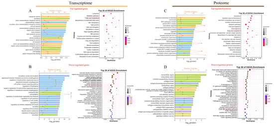 GO and KEGG pathways are enriched. (A,B) GO (left) and KEGG (right) enrichment analysis of up- and downregulated DEGs. (C,D) GO (left) and KEGG enrichment analysis of up- and downregulated DEPs (right). For the GO enrichment analysis diagram, the x-axis represents the gene count and the −log10 (p-value); the y-axis represents the names of the gene enrichment GO classes. Blue represents the biological process category, orange represents the cell component category, and green represents the molecular function category. For the KEGG enrichment analysis diagram, the y-axis represents the name of the KEGG class for the pathways, and the x-axis represents the Rich factor. The size of the dots corresponds to the count, as shown in the legend.