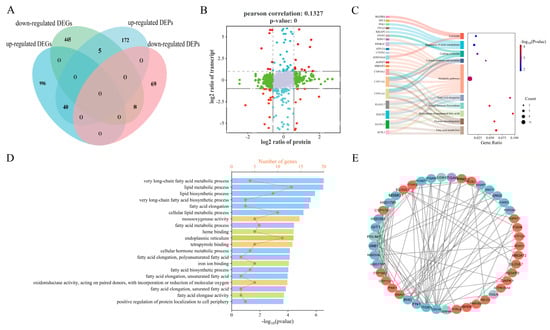 Correlation analysis between the proteomics and transcriptomics data. (A) The Venn diagram of the DEGs/DEPs. Pink represents the downregulated DEPs, lighter blue represents the upregulated DEPs, darker blue represents the upregulated DEGs, and light green represents the downregulated DEGs. A total of 53 pairs of DEGs/DEPs displayed discrepancies in the LB vs. HB fetal calf comparison (mRNA and protein levels), which were classified into 40 upregulated and 8 downregulated. (B) Nine quadrant diagrams. Different points represent genes/proteins with different expression trends. Gray indicates the non-overlapping genes/proteins. Red represents the significant differences in protein and gene expression, green represents the differences in protein expression, and blue represents the differences in transcriptional expression. (C) The significant pathways of co-expressed DEGs/DEPs. The y-axis represents the names of the gene-enriched KEGG categories, and the x-axis represents the Rich factor. The genes in the pathway are shown on the left. (D) The GO enrichment analysis of the co-expressed DEGs/DEPs. The x-axis represents gene count and −log10 (p-value); the y-axis represents the names of the gene enrichment GO classes. (E) Predicted regulatory PPI networks based on the shared co-expressed DEGs/DEPs with the same trend and their potential targeted genes. The confidence level is 0.7. The red exhibits the upregulated DEGs/DEPs and the blue exhibits the downregulated DEGs/DEPs.