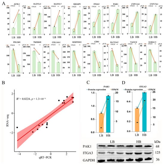 To verify the expression levels of these pairs of genes and to acquire a deeper understanding of intrauterine growth mechanisms, we selected 16 potential candidate DEGs/DEPs with the same trend in the LB and HB calves. These included the following: ACSL1, ELOVL5, ELOVL7, IQGAP2, ITGA3, PAK1, CYP11A1, CYP17A1, PDLIM1, TMSB4X, COL14A1, SERPINH1, CD81, SLC23A2, TAGLN, and S100A13. The expression trend of these chosen genes in the qPCR analysis displayed a consistent trend, as in the RNA-Seq analysis (Figure 5A). The coefficient of determination (R2) was 0.8224 (Figure 5B), indicating a robust fit, and the sequencing data are appropriate for subsequent research analyses. Simultaneously, we utilized Western blotting to validate the expression of Hub DEPs in the placenta, employing GAPDH as a reference protein. PAK1 and ITGA3 were chosen as candidate proteins due to their significant biological functions. The protein expression results were consistent with those from the DIA database, demonstrating that the HB cattle exhibited higher expression levels than the LB cattle, which aligns with the RNA-Seq trends (Figure 5C).
