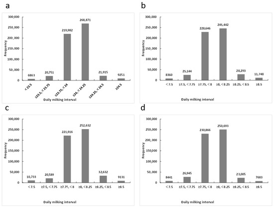 Figure 1. The distribution of milking interval in daily (a), morning (b), noon (c) and night (d) shifts.