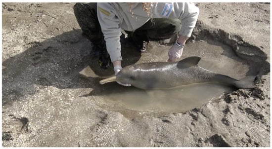 This study was conducted on a franciscana dolphin (Pontoporia blainvillei; Gervais & d’Orbigny, 1844) calf stranded on the coast of San Clemente del Tuyú (36°25′ S, 56°41′ W) in the summer of 2012 (23 January). The rescue crew performed an in-place physical examination and provided first aid attention. The initial care was oriented to keep the animal comfortable and minimize stress, which included overheating protection by placing its flippers and flukes in contact with water in their natural position, protecting its eyes and blowhole from sand, and skin protection from sunburn and rough surfaces (Figure 1).