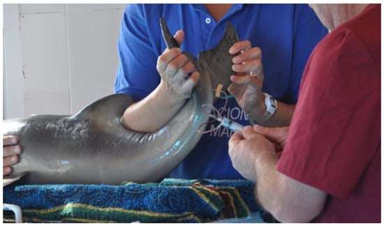 This initial evaluation indicated that the calf was injured, and the mother was not visualized, so it was transported to the FMMRC. The dolphin was placed on a stretcher and transported in a pickup box covered with foam pads and mattresses, with wet towels placed on the animal’s body to keep the skin moist and prevent lesions. Once at the FMMRC, a complete medical examination was performed, and several samples were collected. Blood samples were collected from the coccygeal vein of the caudal peduncle [6,11] with a 25G × 3/4-inch needle butterfly and a 3 cc syringe (Figure 2). The coccygeal vein was selected as the sampling site due to its greater accessibility than the vein of the caudal peduncle in small cetaceans. To obtain a sputum sample for bacteriological analysis, the blowhole was first cleaned to remove water and other contaminants. Following one expiration, the blowhole was flushed with sterile saline. A second expiration resulted in removing most of the saline solution, after which the blowhole was dried with a sterile absorbent swab to eliminate any residual material. A sterile, non-absorbable collection vial was then placed over the blowhole and kept there until exhalation or “chuff” was collected in the vial [12]. Different culture media (EMB, Blood Agar, and Sabouraud Agar) were used for the bacteriology and mycology cultures. A sterile swab was gently inserted 5 cm into the rectum to perform the fecal bacteriological analysis. A stool sample was collected with a probe for a cytological and parasitological evaluation of the feces material [12].