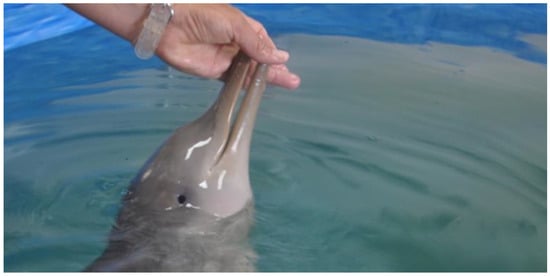 The medical examination revealed that the franciscana dolphin was a female with a length of 96 cm and a weight of 9 kg at the beginning of the predation/weaning period [5]. It was alert and responsive, with a body temperature of 36.6 °C and a respiratory rate of 42 breaths in 10 min. It presented with muffled lung sounds on auscultation and superficial epithelial wounds on the rostral right lateral part of the head (between the eye and the blowhole; Figure 3) and on both caudal fins.