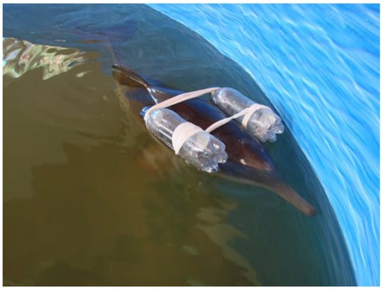 An abnormal swimming pattern was observed, with unilateral buoyancy and difficulty breathing (fast and superficial). Ultrasonography was performed using a Mindray DP30 with a 4.5 MHz probe. A confluence of pulmonary B-lines was observed in the projection area of the right and left cranial lobes, resulting in multiple areas of subpleural consolidation and one area of pulmonary consolidation. As this may indicate pulmonary edema due to saltwater inhalation during stranding, it was immediately treated with a unique dose of furosemide (1 mg/kg, IM, SID) and enrofloxacin (5 mg/kg IM, BID) for 10 days. Additionally, it was assisted with a flotation device with two floats to facilitate breathing and reduce its swimming effort (Figure 4). The flotation device was used until the animal was able to remain stable, which was after one week. Then, the device was removed. Its respiratory frequency showed an average rate of 45 breaths in 10 min during the rehabilitation (4–5/min). The respiratory fluid analysis was not conclusive due to the scarcity of the sample material.