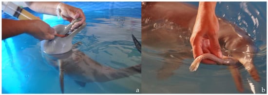 During the first week, only the milk replacer was offered. As the calf refused bottle feeding, this milk substitute was administered every 3 h via a gastric tube (Figure 5a). The daily metabolizable energy (ME) provided by this formula was 938 Kcal, approximately 95.5 Kcal ME/kg; a daily weight gain of 110 g (range 60–240 g) was recorded. The milk substitute was well tolerated, and a positive behavioral response to the feeding tube (swimming directly toward the technician) was observed.