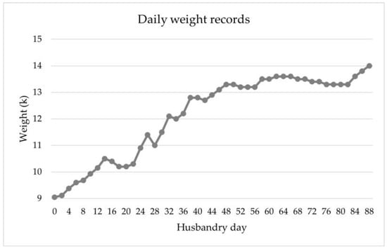 The daily weight gain fluctuated between 0 and 300 g, with an average of 70 g per day. Its daily weight was nearly stable during the first two weeks of this period (weeks 10 and 11; 13.50 ± 0.10 kg). A slight decrease in body weight was observed during the next eight days (13.30 kg), followed by an increase in the following days of up to 14.00 kg. Figure 6 shows the daily recorded weight during the rehabilitation.