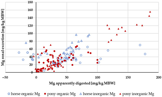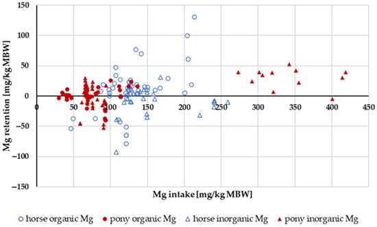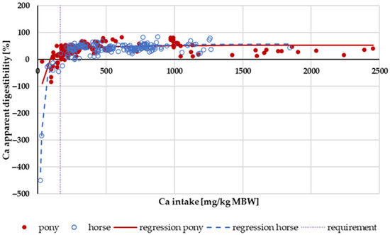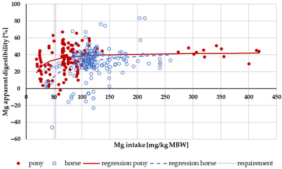In the present meta-analysis, all data are presented per kg of MBW. In species with widely varying adult body weights such as horses or dogs, this has been discussed extensively [24,81,82,83]. To ensure accuracy, all data were also plotted per kg of body weight (BW) where applicable. There was no difference in the results, except for apparent Ca digestibility. For Ca, the difference in apparent Ca digestibility between ponies and horses at low intake was not measurable when intake was expressed as mg/kg BW instead of per kg MBW. The comparison of apparent Ca digestibility was re-evaluated in horses and ponies at an intake level below requirements, in this case, the requirements of NRC 2007 [84], i.e., below 40 mg/kg BW. The data distribution was somewhat different (14 ponies and 10 horses compared to 15 ponies and 8 horses) because requirement limits were either given per kg MBW or kg BW. The apparent digestibility was still numerically different, but the difference was not statistically significant (pony: −9.8%; horse: −26.2%; p = 0.095). It remains unclear whether the observed difference between ponies and horses in apparent Ca digestibility at low intake is due to the dimension or is simply a result of data distribution. In contrast, the aforementioned differences between horses and ponies in apparent Mg digestibility remained significant, regardless of the method of plotting or the dimension (Figure 13 and Figure 14).