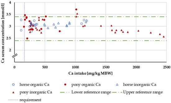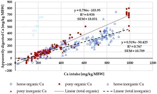 When the apparently digested amount of Ca was plotted against intake, it became evident that the regressions for “organic” or “inorganic” sources were different, with a higher slope for the “organic” sources, suggesting a higher true digestibility. Ca in grass is mainly soluble [85]. The solubility of Ca in grass or legumes amounts to 50 to 80% [86]. The “inorganic” sources were mostly CaCO3 and CaHPO4. These compounds are not very soluble in water. In horses, Ca is mainly absorbed in the small intestine [79]. Therefore, it is not surprising that highly soluble sources have a higher apparent digestibility than Ca compounds with low water solubility.