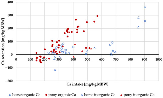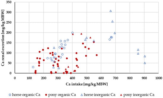 For Ca intakes exceeding 1000 mg/kg MBW, data were only available from ponies fed “inorganic” Ca sources. Consequently, the diagrams comparing “organic” and “inorganic” Ca sources—regarding the apparently digested Ca quantity, renal Ca excretion and Ca retention—were limited to an intake of up to 1000 mg/kg MBW.