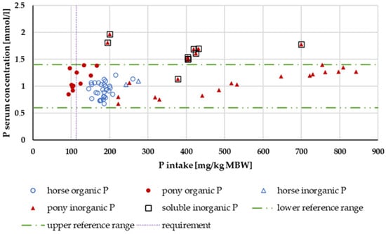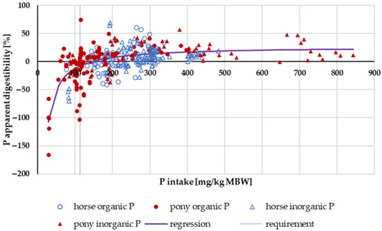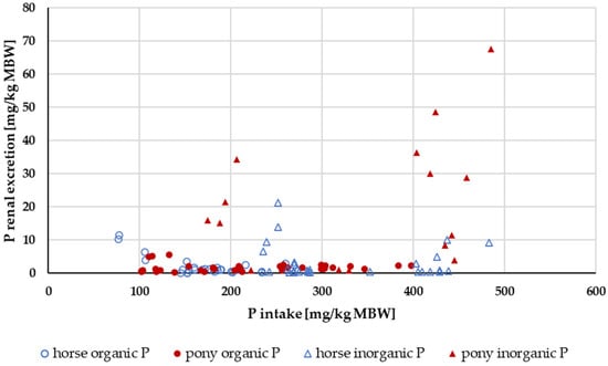 The plots of renal P excretion and retention in relation to P intake were restricted to an intake of up to 500 mg/kg MBW because data above this level were limited to ponies consuming “inorganic” P.