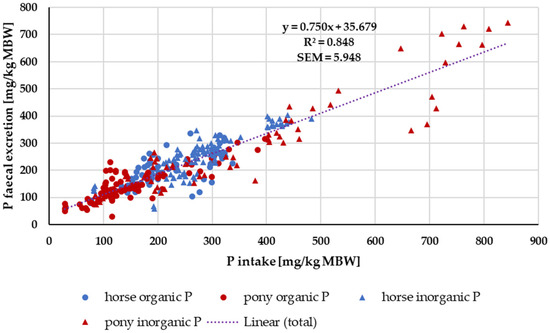 Faecal P excretion in relation to P intake (both in mg/kg MBW). Data without information on P source were not used.