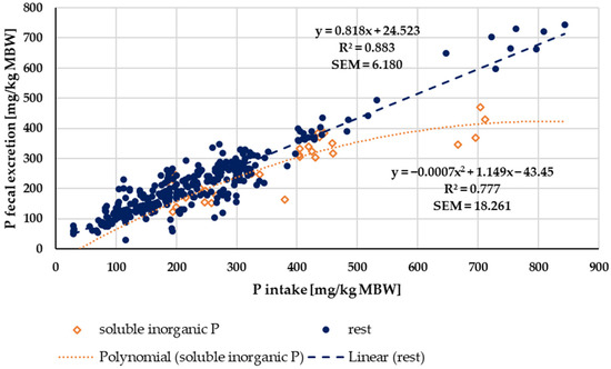 Faecal P excretion in relation to P intake (both in mg/kg MBW). Data without information on P source were not used. Trendlines mark water-soluble “inorganic” P sources and all other sources.