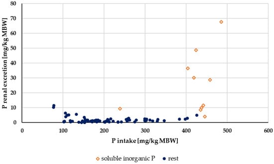 Relationship between P intake and renal P excretion (both in mg/kg MBW) from Figure 10 with differentiation of P sources into soluble “inorganic” sources and other sources. Data on unknown “inorganic” P sources were not used.