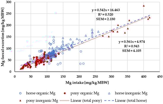 Relationship between Mg intake and faecal Mg excretion (both in mg/kg MBW). Data without information on Mg source were not used. Trendlines mark data of horses compared to ponies.