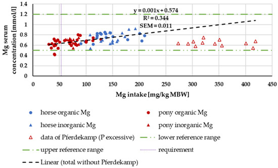 In Figure 15, the serum Mg level is plotted against Mg intake. With the exception of the study of Pferdekamp [50], there was a significant increase in serum Mg concentration with increasing intake. Pferdekamp [50], however, used a ration with exceptionally high Ca and P intake. For comparison, the median Ca intake in the aforementioned study was 1771.36 mg/kg MBW, whereas the median Ca intake in the other studies referenced in the figure was 361.27 mg/kg MBW. Due to the data distribution, differences between horses and ponies or “organic” and “inorganic” sources could not be further investigated.