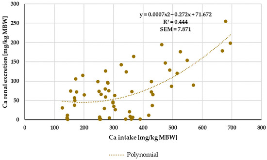 Relationship between Ca intake and renal Ca excretion (both in mg/kg MBW). Only data up to an intake of 1000 mg/kg MBW and with information on Ca source were taken into account. The Ca:P ratio was limited to 1:1–5:1. Experiments with shifts in acid–base balance were excluded.