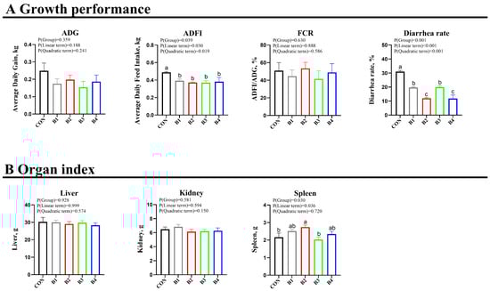 Effect of IRR on the growth performance of weaning piglets. (A) Growth performance, (B) Organ index. ADG, average daily gain; ADFI, mean daily feed intake; FCR, ratio of average daily gain intake to average daily feed. CON = basal diet, B1 = basal diet supplemented with 0.5% IRR, B2 = basal diet supplemented with 1.0% IRRe, B3 = basal diet supplemented with 2.0% IRR, and B4 = basal diet supplemented with 4.0% IRR. In the regions marked as a, b, and c within the figure, no significant differences were observed among groups denoted by the same letter. Conversely, statistically significant differences were evident between groups designated by different letters.