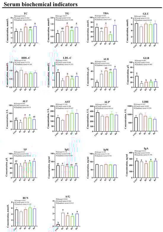 Effect of IRR on serum biochemical parameters of weaning piglets. Serum biochemical indicators. TC = total cholesterol; GLU = glucose; TBA = total bile acid; HDL-C = high-density lipoprotein cholesterol; LDL-C = low-density lipoprotein cholesterol; ALT = alanine aminotransferase; AST = aspartate aminotransferase; ALP = alkaline phosphatase; LDH = lactate dehydrogenase; TP = total protein; ALB = albumin; GLB = globulin; A/G = albumin to globulin ratio; BUN = blood urea nitrogen; IgG = immunoglobulin G; IgM = immunoglobulin M; IgA = immunoglobulin A. CON = basal diet, B1 = basal diet supplemented with 0.5% Isatidis Root Residue, B2 = basal diet supplemented with 1.0% Isatidis Root Residue, B3 = basal diet supplemented with 2.0% Isatidis Root Residue, and B4 = basal diet supplemented with 4.0% Isatidis Root Residue. In the regions marked as a, b, and c within the figure, no significant differences were observed among groups denoted by the same letter. Conversely, statistically significant differences were evident between groups designated by different letters.
