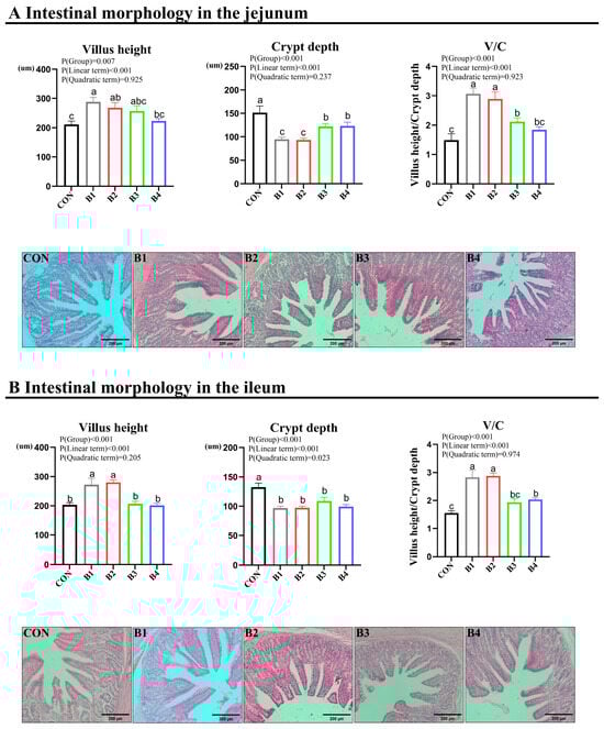 Effect of IRR on immunity and intestinal morphology. (A) Intestinal morphology in the jejunum, (B) Intestinal morphology in the ileum. V/C = villus height/crypt depth. B1 = basal diet supplemented with 0.5% IRR, B2 = basal diet supplemented with 1.0% IRR, B3 = basal diet supplemented with 2.0% IRR, and B4 = basal diet supplemented with 4.0% IRR. In the regions marked as a, b, and c within the figure, no significant differences were observed among groups denoted by the same letter. Conversely, statistically significant differences were evident between groups designated by different letters.