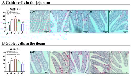 Effect of IRR on goblet cells in the jejunum and ileum. (A) Goblet cells in the jejunum, (B) Goblet cells in the ileum. B1 = basal diet supplemented with 0.5% IRR, B2 = basal diet supplemented with 1.0% IRR, B3 = basal diet supplemented with 2.0% IRR, and B4 = basal diet supplemented with 4.0% IRR. In the regions marked as a, b, c and d within the figure, no significant differences were observed among groups denoted by the same letter. Conversely, statistically significant differences were evident between groups designated by different letters.
