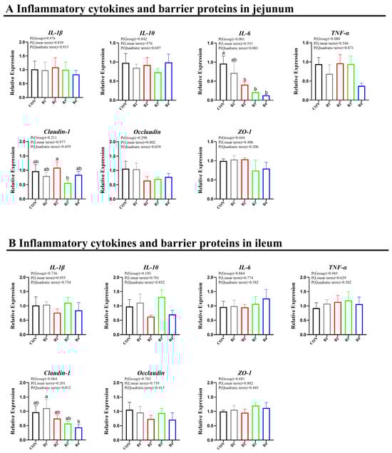Effect of IRR on intestinal inflammation and the intestinal barrier. (A) Inflammatory cytokines and barrier proteins in the jejunum, (B) Inflammatory cytokines and barrier proteins in the ileum. IL-β = interleukin-β, IL-10 = interleukin-10, IL-6 = interleukin-6, TNF-α = tumor necrosis factor-α. B1 = basal diet supplemented with 0.5% IRR, B2 = basal diet supplemented with 1.0% IRR, B3 = basal diet supplemented with 2.0% IRR, and B4 = basal diet supplemented with 4.0% IRR. In the regions marked as a and b within the figure, no significant differences were observed among groups denoted by the same letter. Conversely, statistically significant differences were evident between groups designated by different letters.