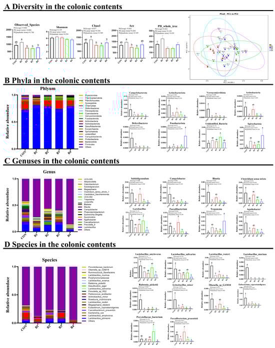Effect of IRR on the gut microbiota of early weaning piglets. (A) Diversity in the colonic contents, (B) Phyla in the colonic contents, (C) Genera in the colonic contents, (D) Species in the colonic contents. B1 = basal diet supplemented with 0.5% IRR, B2 = basal diet supplemented with 1.0% IRR, B3 = basal diet supplemented with 2.0% IRR, and B4 = basal diet supplemented with 4.0% IRR. In the regions marked as a and b within the figure, no significant differences were observed among groups denoted by the same letter. Conversely, statistically significant differences were evident between groups designated by different letters.