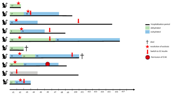 Ten cats were included in the study. Cats were between one and 13 years old (median 9; IQR 6.5–10). Seven cats were castrated males, and three were spayed females. There were seven Domestic Shorthair, two British Shorthair and one Maine Coon cat. The median BCS was 5/9 (IQR 3–5.5; range 2–9/9). In one cat, BCS was not recorded. Median time to switch from insulin CRI to intermittent intermediate SC insulin was 5 days (IQR: 2.75–6.75; range 1–10). One cat went into remission during hospitalisation and therefore no €C insulin administration was started after stopping insulin CRI. Two of 10 cats died during hospitalisation. Eight cats were discharged after a median hospitalisation period of 9.5 days (IQR 6.75–11.25; range 2–16) (Figure 1). For one cat, clinical information on hydration status and resolution of acidosis was not available. This cat was excluded from all analyses relating to hydration status but was included in the overall analysis. Additional information depicted in Figure 1 is discussed further in the Section 3.