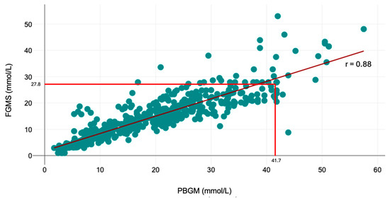 There was a good overall correlation between the FGMS and PBGM (correlation coefficient r = 0.88, p < 0.001). The scatter plot (Figure 2) shows a linear trend for the FGMS to render lower values than the PBGM. The median glucose concentration measured by the FGMS 2.0 was significantly lower than the glucose concentration measured by the PBGM (14.3 mmol/L, IQR, range, 1.1–53 mmol/L vs. 19 mmol/L, IQR, range, 1.7–57.5 mmol/L; p < 0.001).