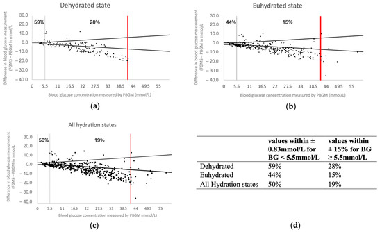 Analysis of the Bland–Altman plot performed separately for values obtained in eu- and dehydrated states showed similar results as the Bland–Altman plot using all values, suggesting that hydration status had no significant impact on the agreement between FGMS 2.0 and PBGM (Figure 3b,c). Glucose concentrations measured by the FGMS 2.0 were most often lower than glucose concentrations measured by the PBGM, with a few exceptions, which occurred mainly at mild to moderate hyperglycaemia (Figure 3a–c).