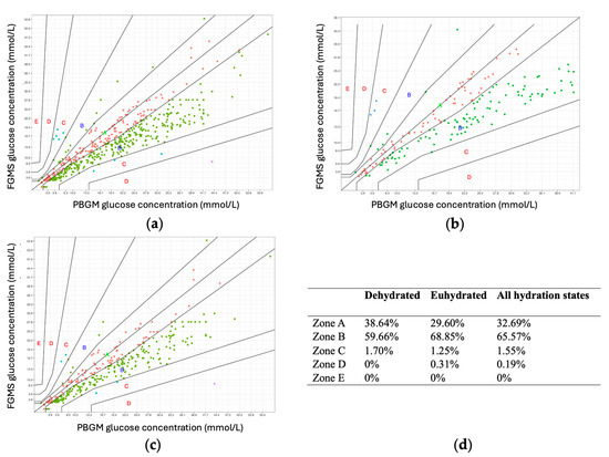 Analysis of Parkes EGA performed separately for values obtained in eu- and dehydrated states showed similar results as Parkes EGA using all values, suggesting that hydration status had no significant impact on the agreement between the FGMS 2.0 and PBGM (Figure 4b,c).
