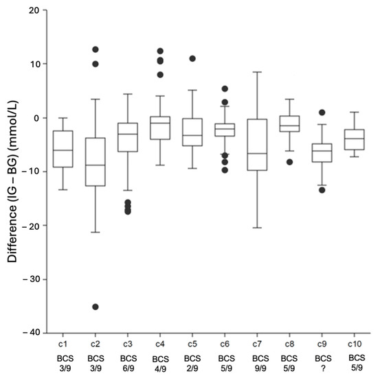 Box plots displaying inter-patient variability. Each box plot represents the differences between IG measured by the FGMS and BG measured by the PBGM of a single cat. Central lines within the boxes represent median values, whereas the borders of the box represent inter-quartile ranges. The whiskers indicate range outside the upper and lower quartiles, and the dots represent outliers. For each individual cat, body condition scores (BCS) are depicted where available. KWA was performed and revealed significant inter-patient differences between the FGMS 2.0 and PBGM measurements (p < 0.000001). Abbreviations: BG = blood glucose, IG = interstitial glucose, KWA = Kruskal–Wallis ANOVA.