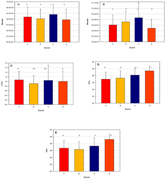 The AMS of the same brand showed a significantly lower vacuum level in the MPC (Figure 2C), while the DVFs (Figure 2D) were significantly different among all the brands, with the lowest mean value for brand B and the highest for brand C.