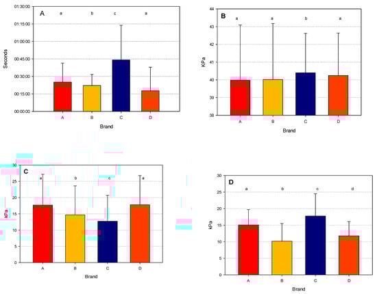 The OMD was significantly higher for brand C (Figure 2A), while it was very similar for the other brands, while the MOV was around 40 kPa for all the four brands, although a significantly higher mean value was observed for brand C (Figure 2B).