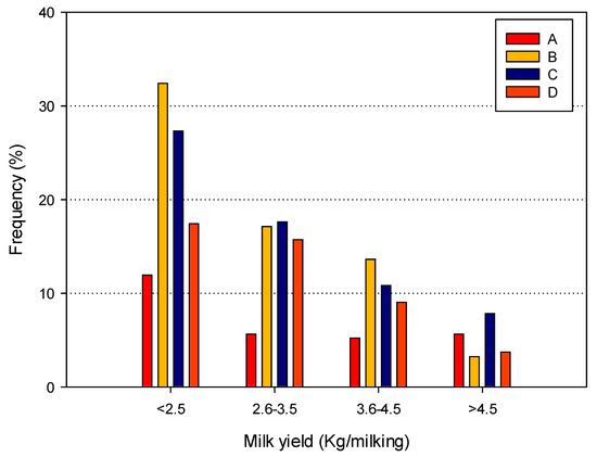 where Y = dependent variables (milking parameters); µ = general mean; Bj = effect of brand (j = A, B, C, D); and Mk = effect of milk yield (j ≤ 2.5 kg/quarter; 2.6–3.5 kg/quarter; 3.6–4.5 kg/quarter; >4.5 kg/quarter).
