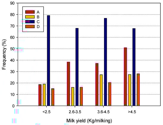 The analysis of the frequency of the different brands by milk yield showed significant differences (Table 3). Brand A had a low frequency of records in low-yielding quarters, significantly different from the frequencies observed for all the other yield classes. The records in the highest yield class had the highest frequency among all the other classes. Brand B showed a linear distribution of the records among the yield classes, but the frequency of the lowest yield class was significantly higher than the other classes. Brand C showed a trend with a consistent and significant increase in the frequencies as milk yield increased. Brand D had the highest frequency of records in the <2.50 Kg class among all brands, and it was significantly different from all the other yield classes.