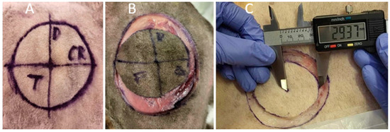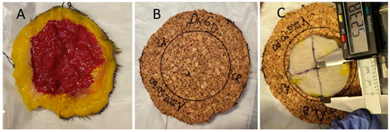 Preparation of the specimen. (A) A planned line of incision, 60 mm in diameter with a circular shape, with a marked centre and diameter divided by vertical and horizontal lines and marked directions. (B) The lateral margin incision was made along a previously drawn line. (C) Measurement of the radius immediately of the lateral margin incision.