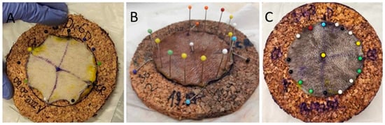 A radius of 60 mm was drawn on a 3 mm thick piece of cork board (Figure 2B); the excised samples were extended manually and then fixed in place with pinpoint needles (Figure 3A,B), and the previous measurements were repeated.