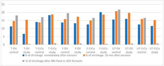 The mean percentage of skin shrinkage of the control group specimens 48 h after 10% formalin fixation ranged from 16.53% ± 1.63 (SE) (F-CrCa) to 21.73% ± 2.72 (SE) (UT-DV).