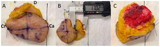 A skin incision was made along the drawn line through the skin, subcutis, and superficial fascia (Figure 1B). The dorsal direction of the samples was marked with a single interrupted suture pattern suture, and the cranial direction with two simple interrupted suture pattern sutures. The deep margin was dissected with scissors, and the specimen collection was completed. The lateral and deep margins of the specimens were stained with ink after resection (Figure 2A).