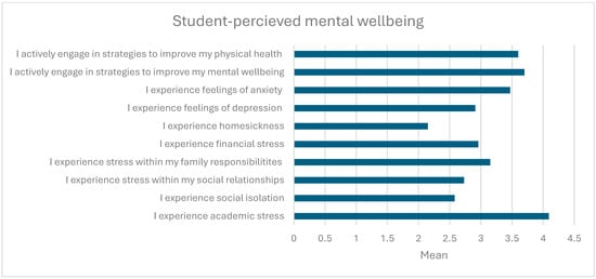 Figure 1 shows participants’ ratings of their perceived mental health and wellbeing on a five-point Likert scale from one (never/almost never) to five (frequently/daily). Overall, participants indicated experiencing a moderate level of stress across all determinants; however, they rated their academic stress highest (M = 4.09, SD = 0.69). On average, students also reported occasionally (i.e., monthly) engaging in strategies to support their mental (M = 3.7, SD = 1.00) and physical (M = 3.6, SD = 1.8) health. When asked to rate whether they agreed or disagreed (1 = strongly disagree, 5 = strongly agree) that their university had adequate services to support their mental health and wellbeing, on average, students indicated moderate agreement (M = 3.22, SD = 1.01) that their university provided adequate mental health support services.