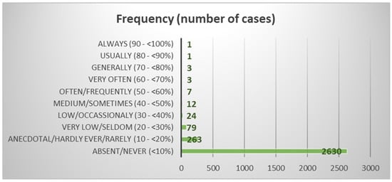 Figure 1 provides insights into the distribution and prevalence of deviations at different frequency levels, revealing the overall pattern and significance within the dataset. To address biases from unequal group sizes and ensure fair analysis, regularization was applied to the priors based on group sizes. This approach, using SPSS Version 26.0 for Windows (SPSS, Inc., Chicago, IL, USA), improved classification quality and prevented skewed results from imbalanced group sizes [10].