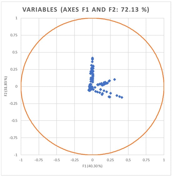 As suggested in Table S2, only the two most relevant functions were used to build a standardized discriminant coefficient biplot, capturing the highest fraction of variance (Figure 1). In this regard, those variables whose vector extends further apart from the origin most relevantly contributed to the first (F1) and second (F2) discriminant functions.