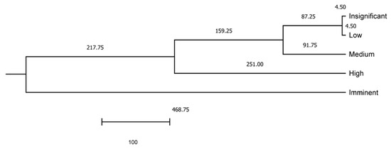 Two main clusters are formed, the first represented by Imminent risks, which was the most distant level from the rest (Mahalanobis distance of 468.75) when deviation combinations are considered, and a second cluster comprising the rest of the risk levels (217.75). Two subclusters are formed within the second cluster, the first at 251.00, comprising High-risk levels, and the second one comprising Medium, Low, and Insignificant risk levels at 159.25. It is within the second subcluster where two subsubclusters are formed. The first subsubcluster comprises medium risk levels at 91.75, and a second subsubcluster (87.25) accounts for two additional branches at 4.50, comprising Low and Insignificant risk levels, respectively.