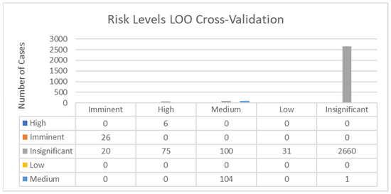 All the cases which were determined as High or Imminent were correctly classified. Despite most of the cases classified as Insignificant being correctly classified (92.17%), 20 cases considered as Imminent were indeed Insignificant; 75 cases labeled as High were indeed Insignificant, 100 cases classified as Medium were indeed Insignificant and 31 cases classified as Low were indeed Insignificant, respectively. None of the cases classified as Low acted as low-risk cases. All the cases classified as Medium were correctly classified except for 1, which was an Insignificant risk-level case.