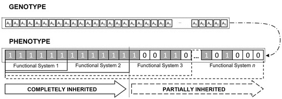 The model organism in our simulations was made up of functional systems, and each system consisted of a number of elements (Figure 1). The phenotype is described by the set P of f binary strings given by ei for the ith functional system: